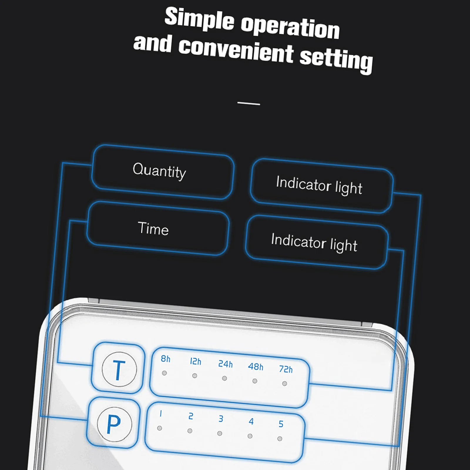 Simple operation and convenient setting. At the top is a transparent bucket with a clear surplus so you know when to put fish food.